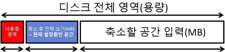 | 사용할 수 있는 축소 공간의 크기(MB) | 선택한 영역이 사용하고 있는 영역을 제외하고 미사용중인 영역을 의미한다. |