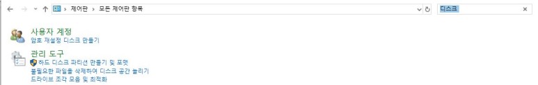 제어판에 들어가면 오른쪽 상단에 '제어판 검색'이라 적혀있는 입력창이 보입니다. 여기에 '디스크'라고 검색을 하면 다음과 같은 화면을 볼 수 있습니다.