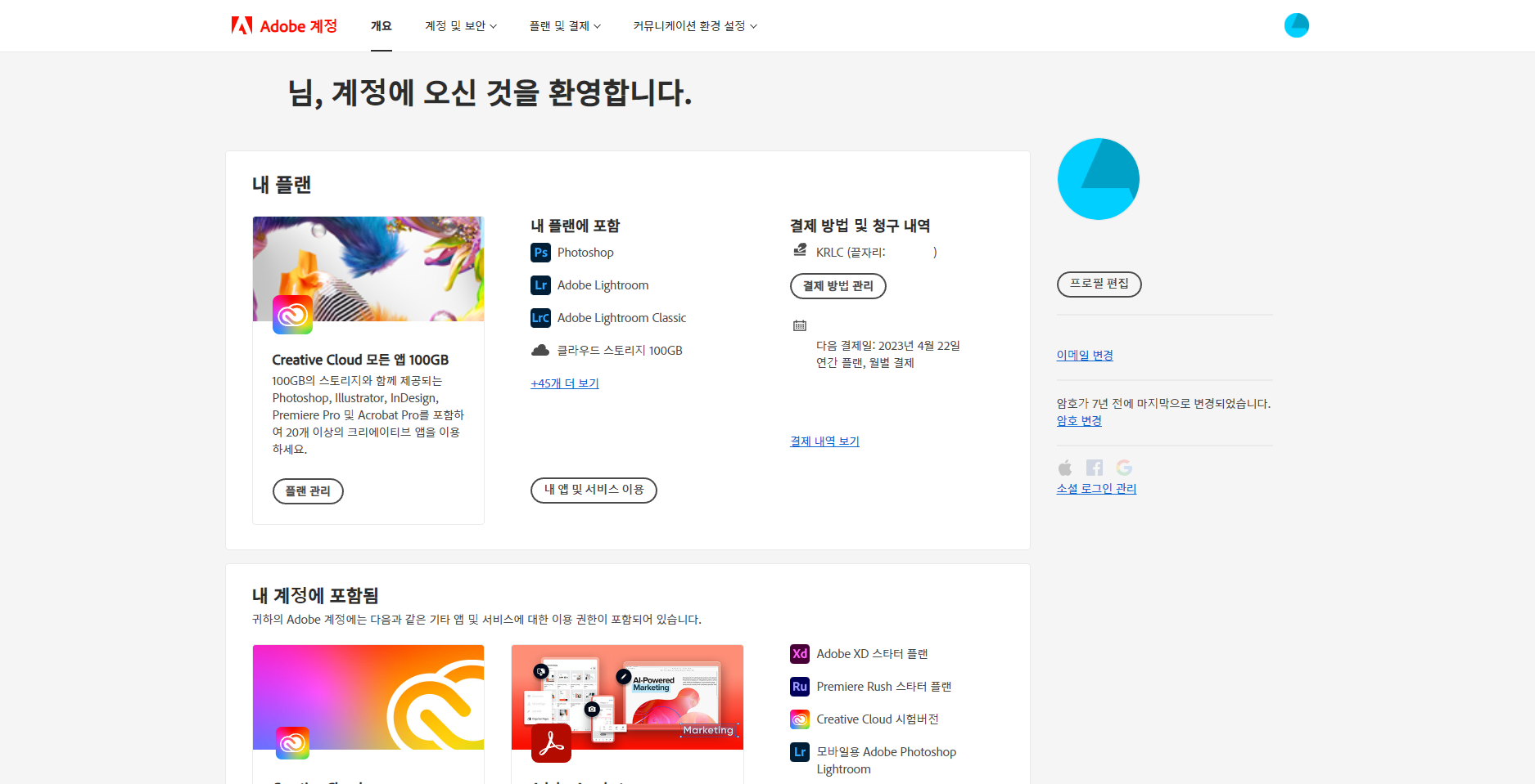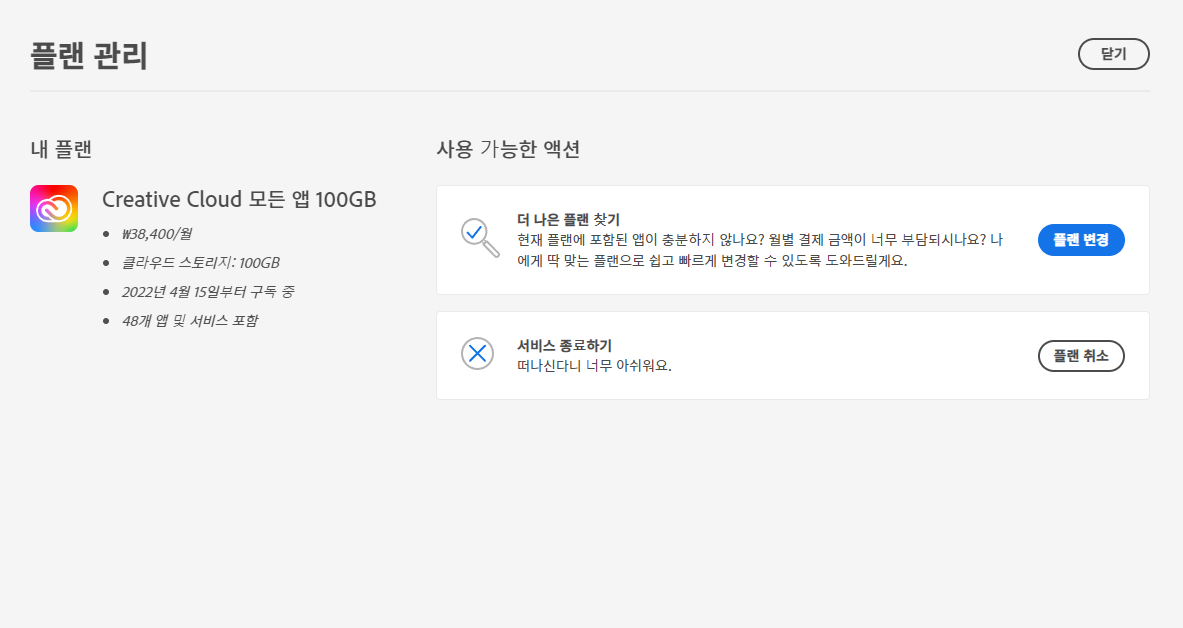 어도비 공식사이트에 들어가 로그인을 한 다음, 오른쪽에 동그란 프로필사진을 클릭해 '계정 보기'를 누르시면, 결제가 언제 진행되는지, 가입한 플랜이 무엇인지 확인할 수 있습니다. 여기서 '내 플랜 - 플랜 관리' 버튼을 눌러주세요.